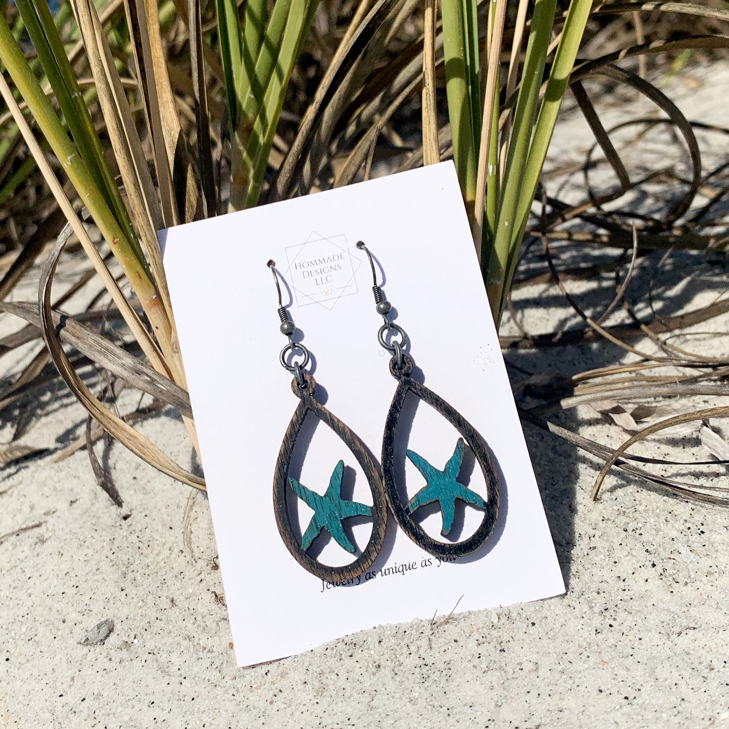Laser cut / engraved walnut beachy earrings. These beautiful earrings are hand painted with oil paints & are finished off with Nickel free fittings. Take these earrings along on your next beach vacation - everyone will be envious!