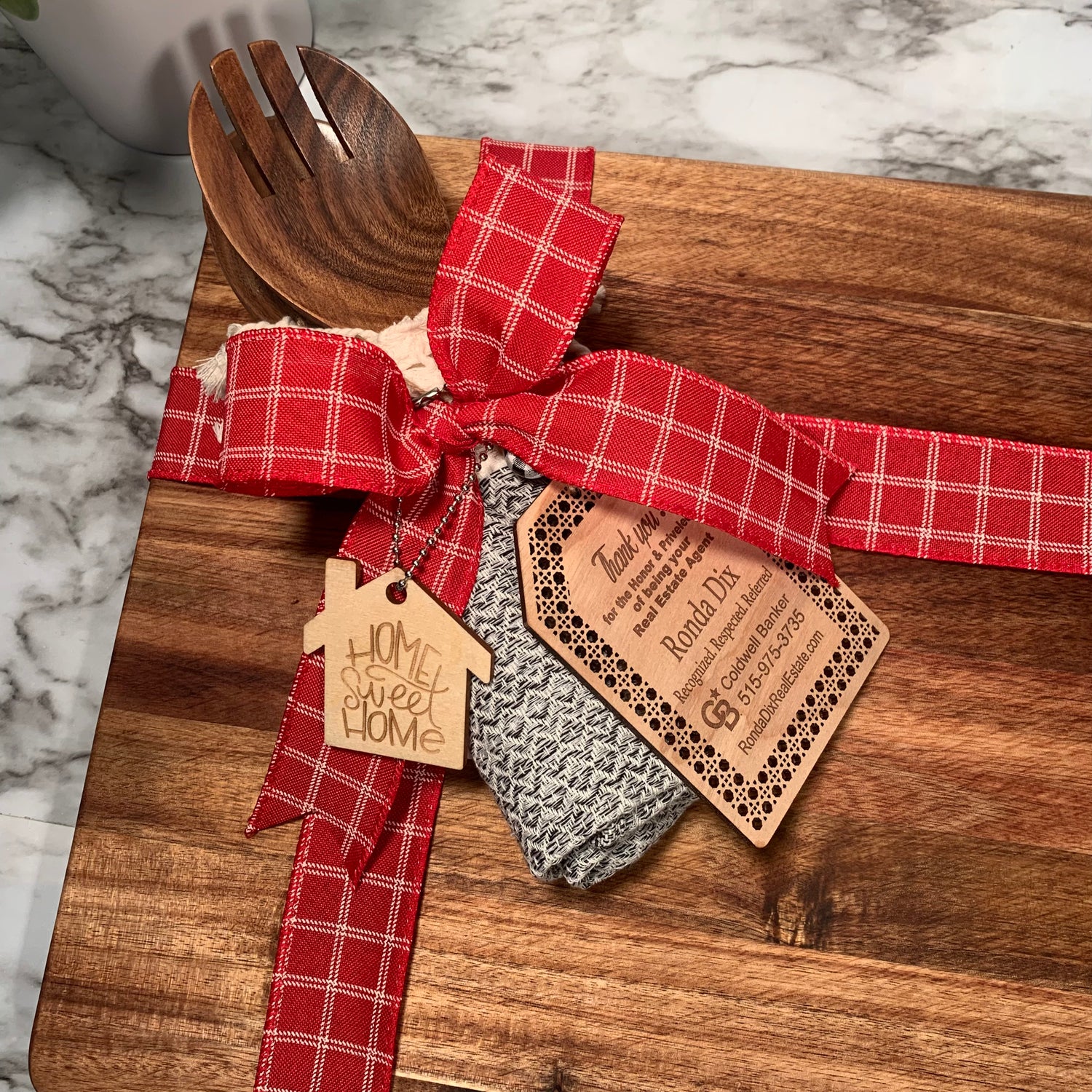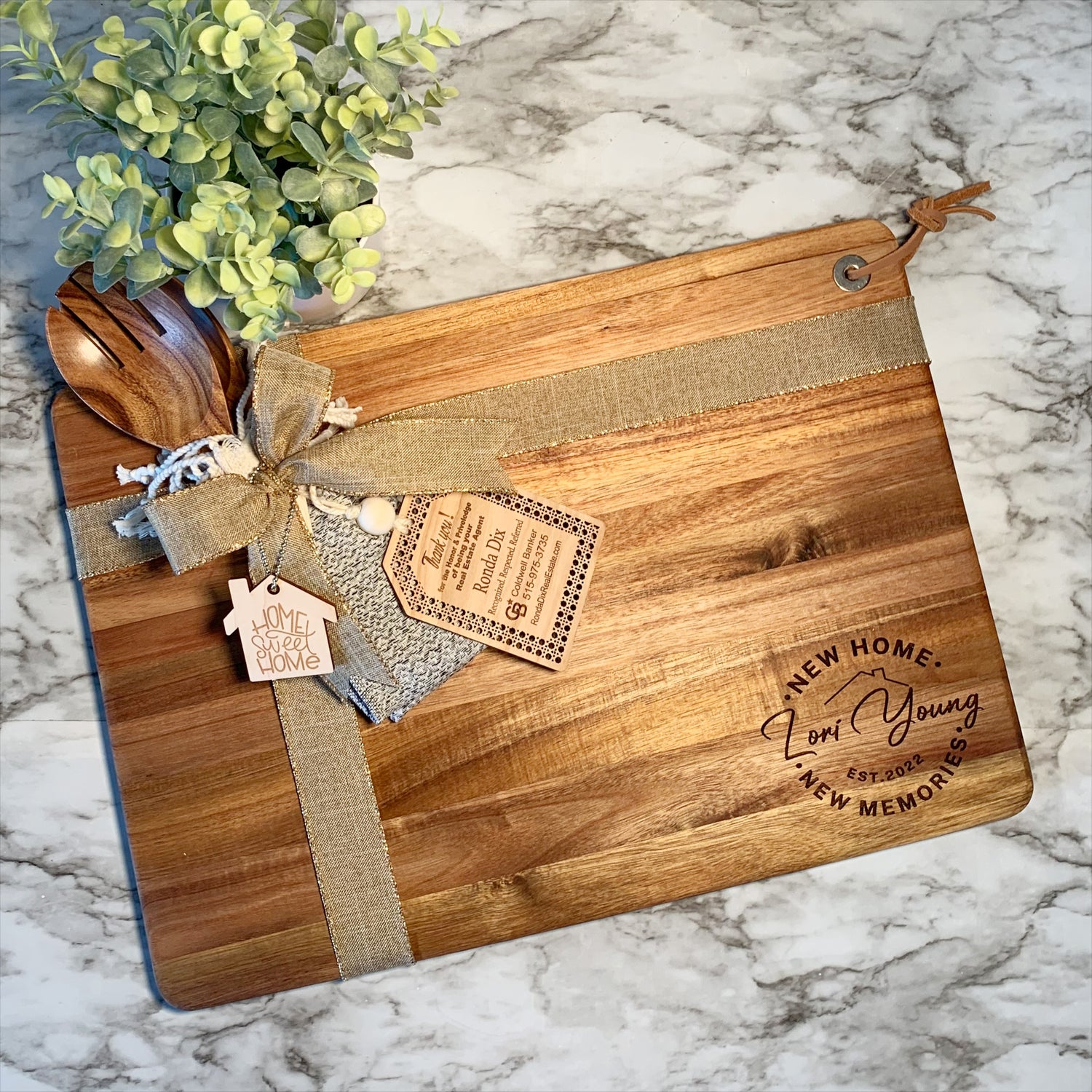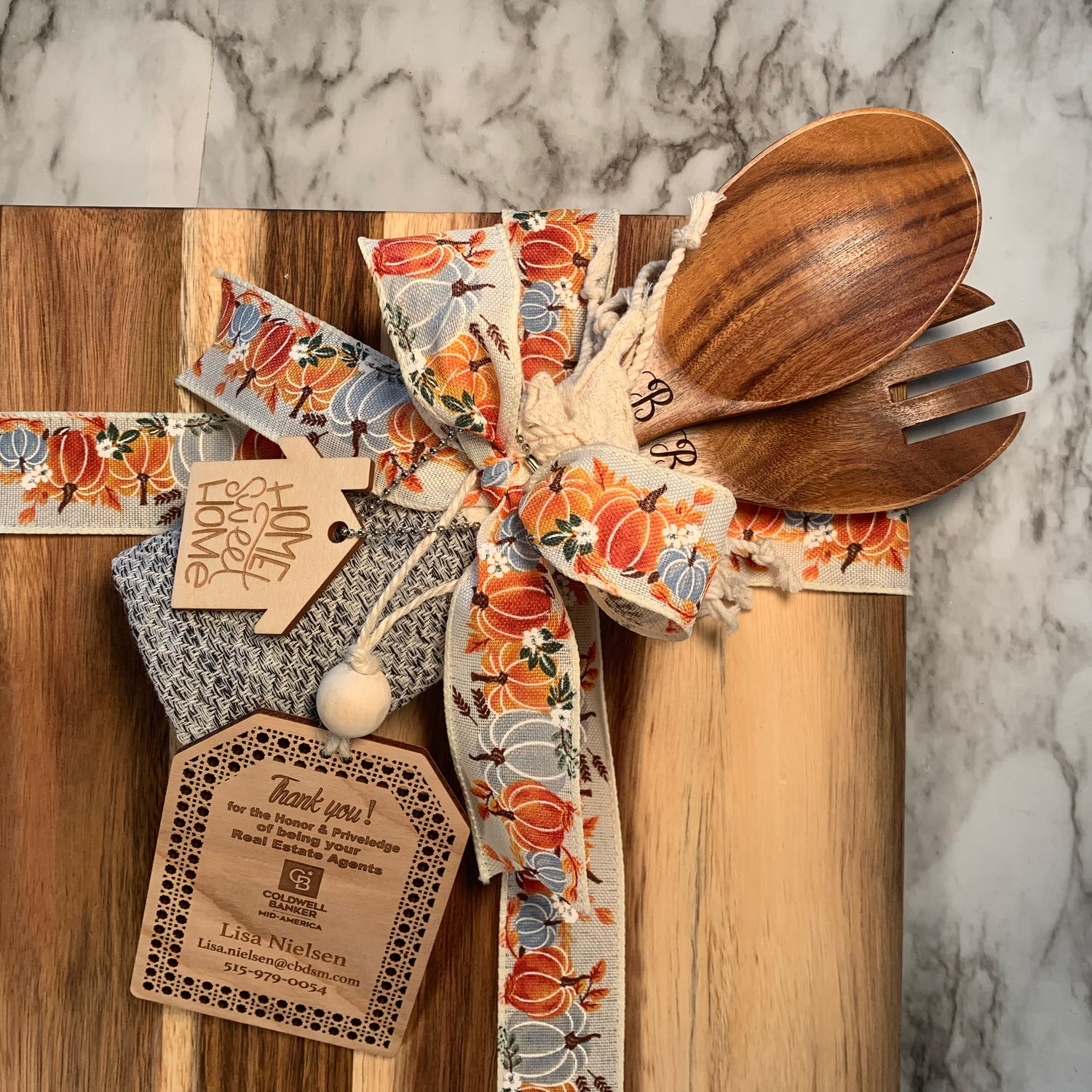 This beautiful personalized cutting board bundle makes the perfect gift for a Real Estate Closing! Give your clients a unique and very personal gift they will treasure for years to come. We will include your business branding free of charge.