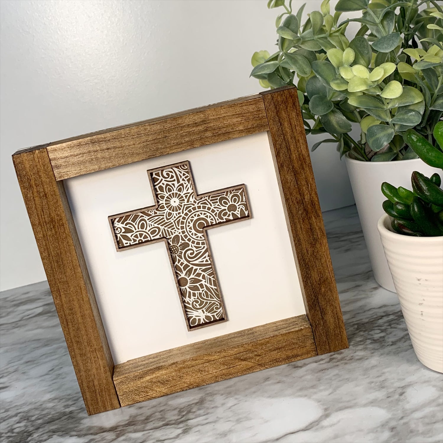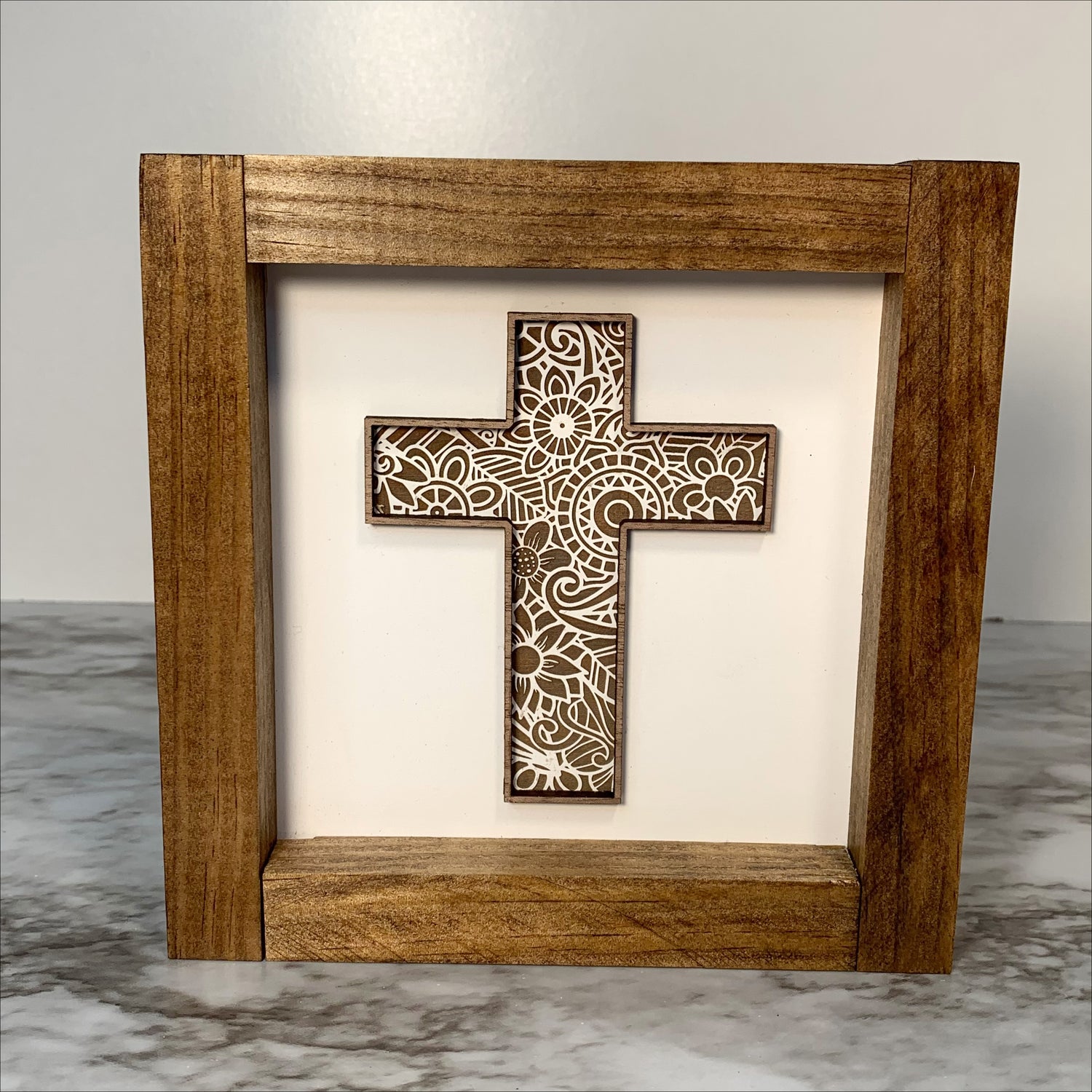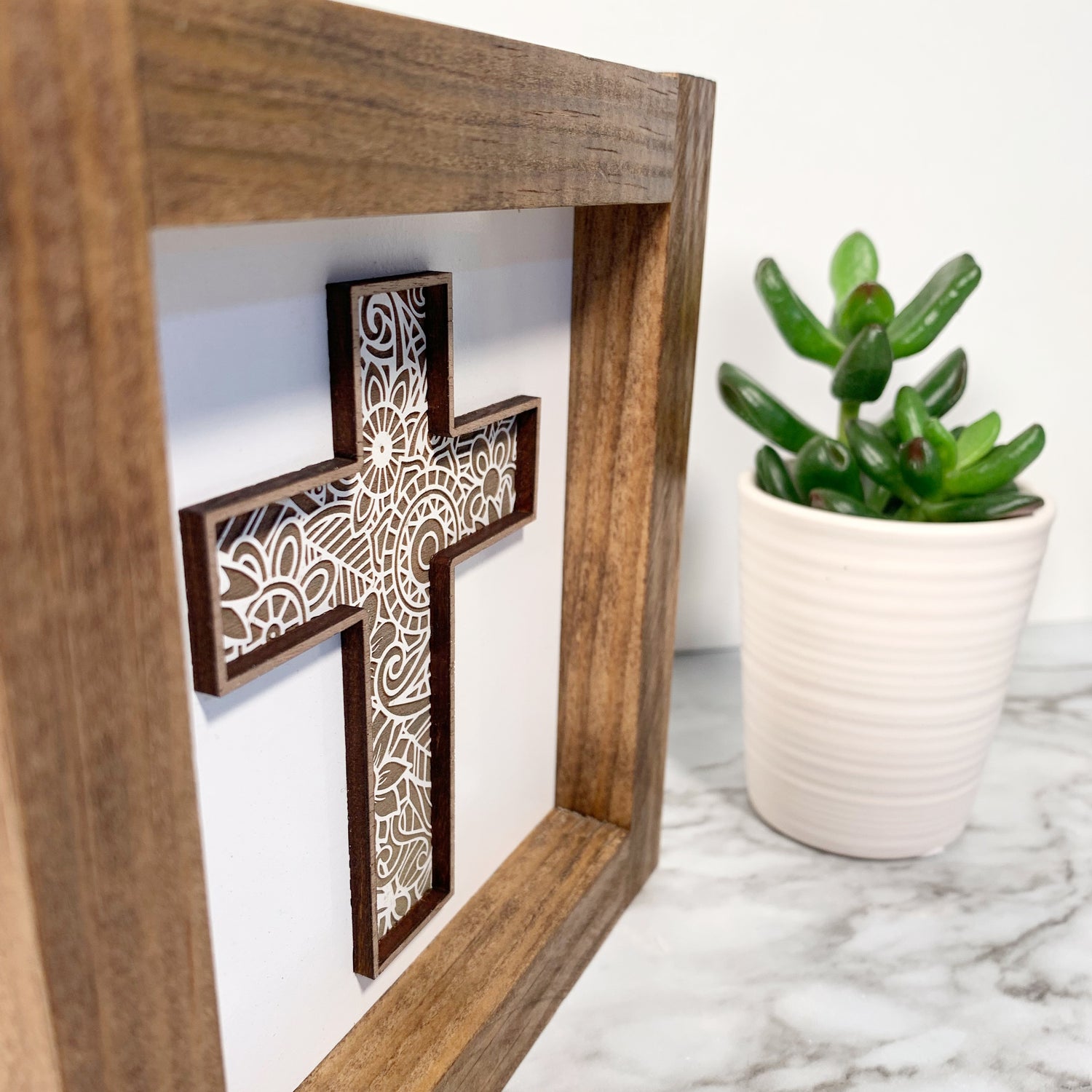 This stunning Mandala Cross will look fabulous in your home, whether as a accent piece or a focal point. This delicate small art piece is handcrafted from whiteboard and Walnut with a pine frame. The mandala is engraved into the background and a delicate cross constructed of walnut is attached - 3D style.