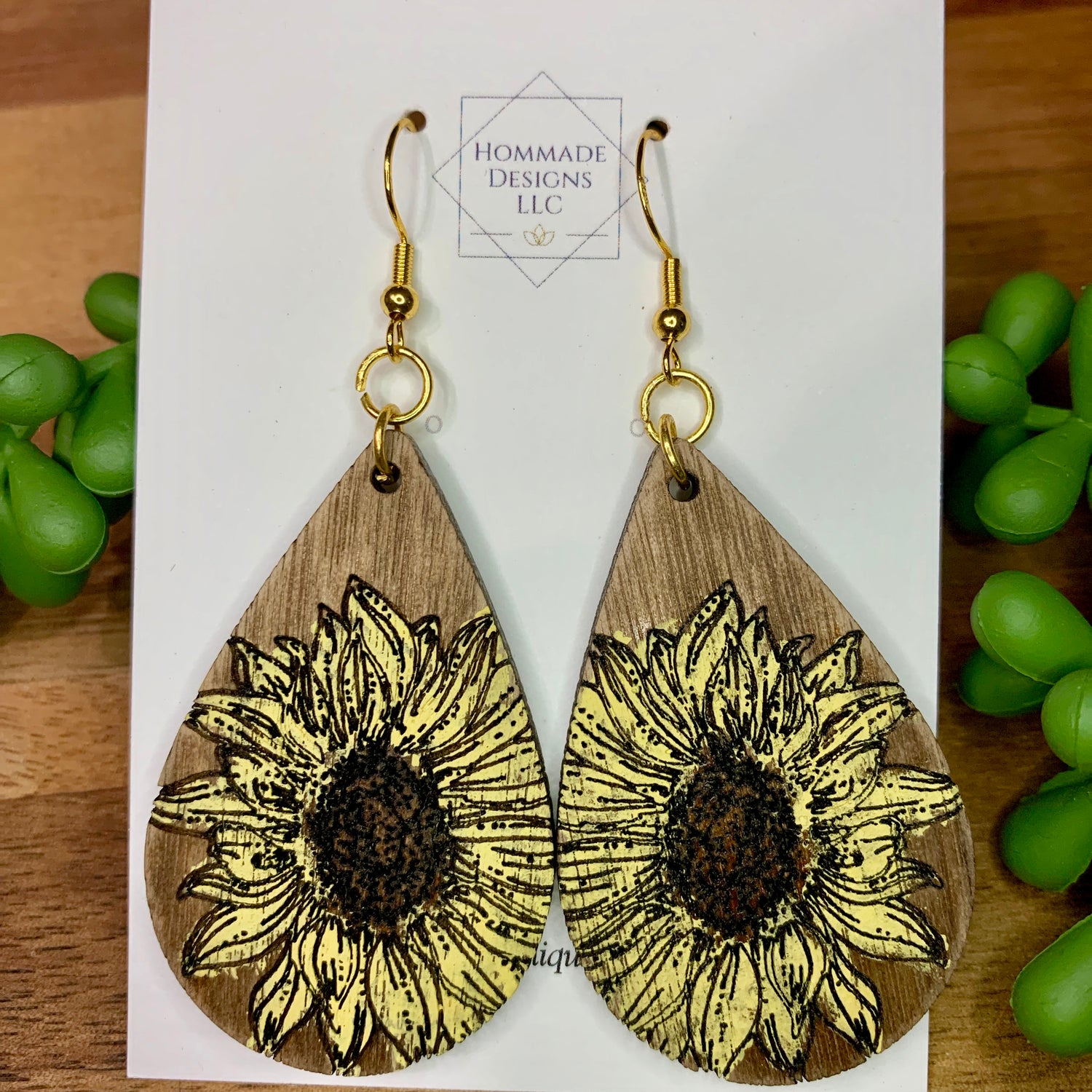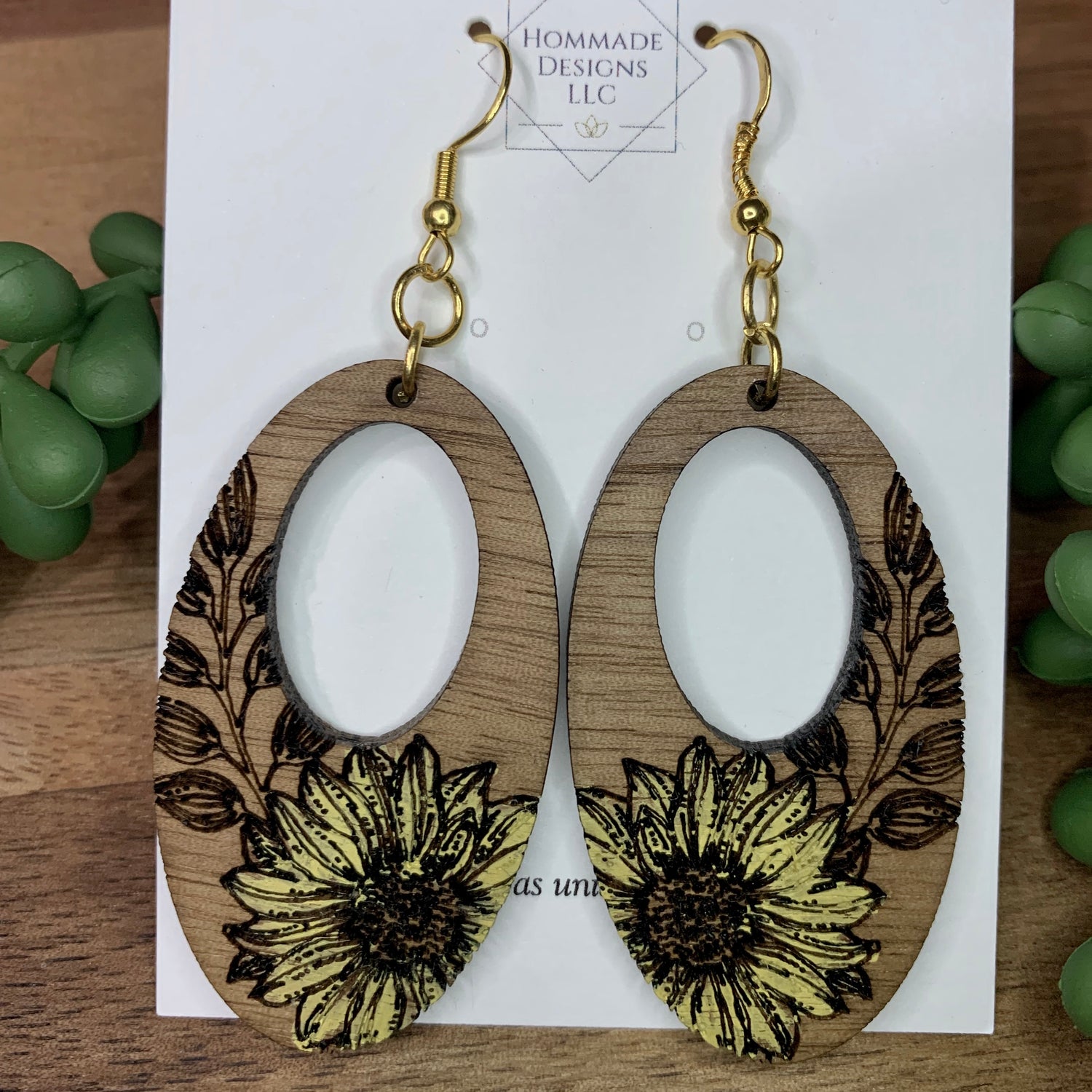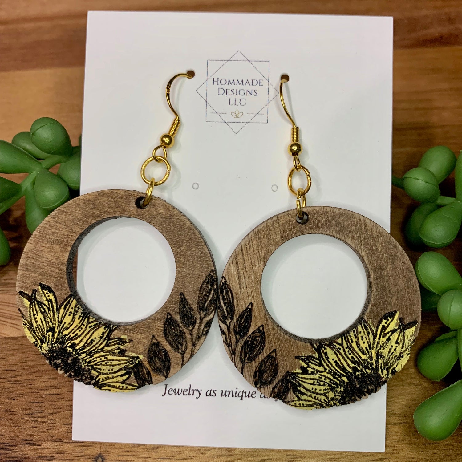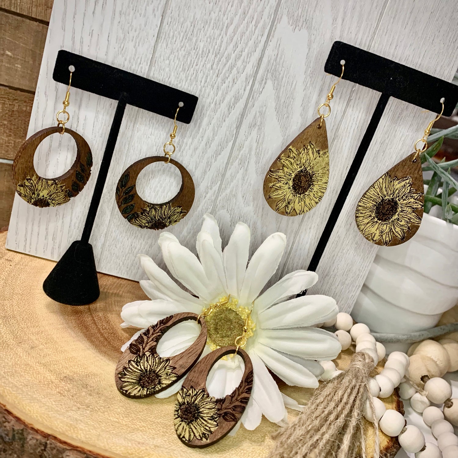 Laser engraved sunflower earrings. Cut from 1/8" Walnut ply - which makes them durable but lightweight. . Each beautiful pair is hand painted and fitted with Nickel free fittings.