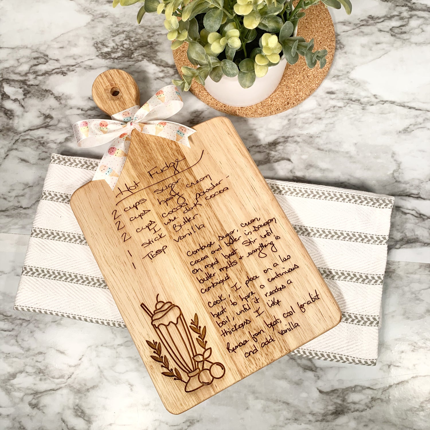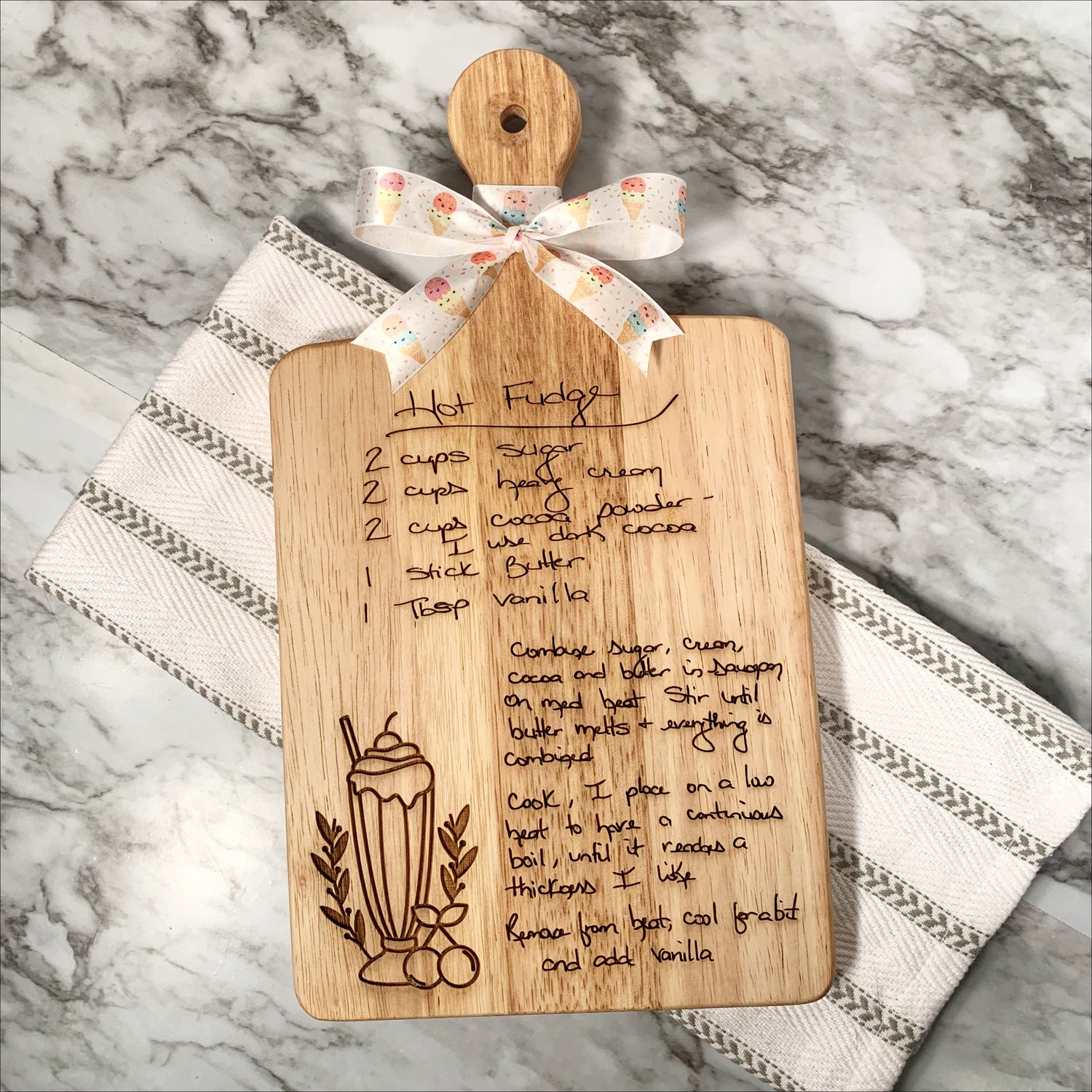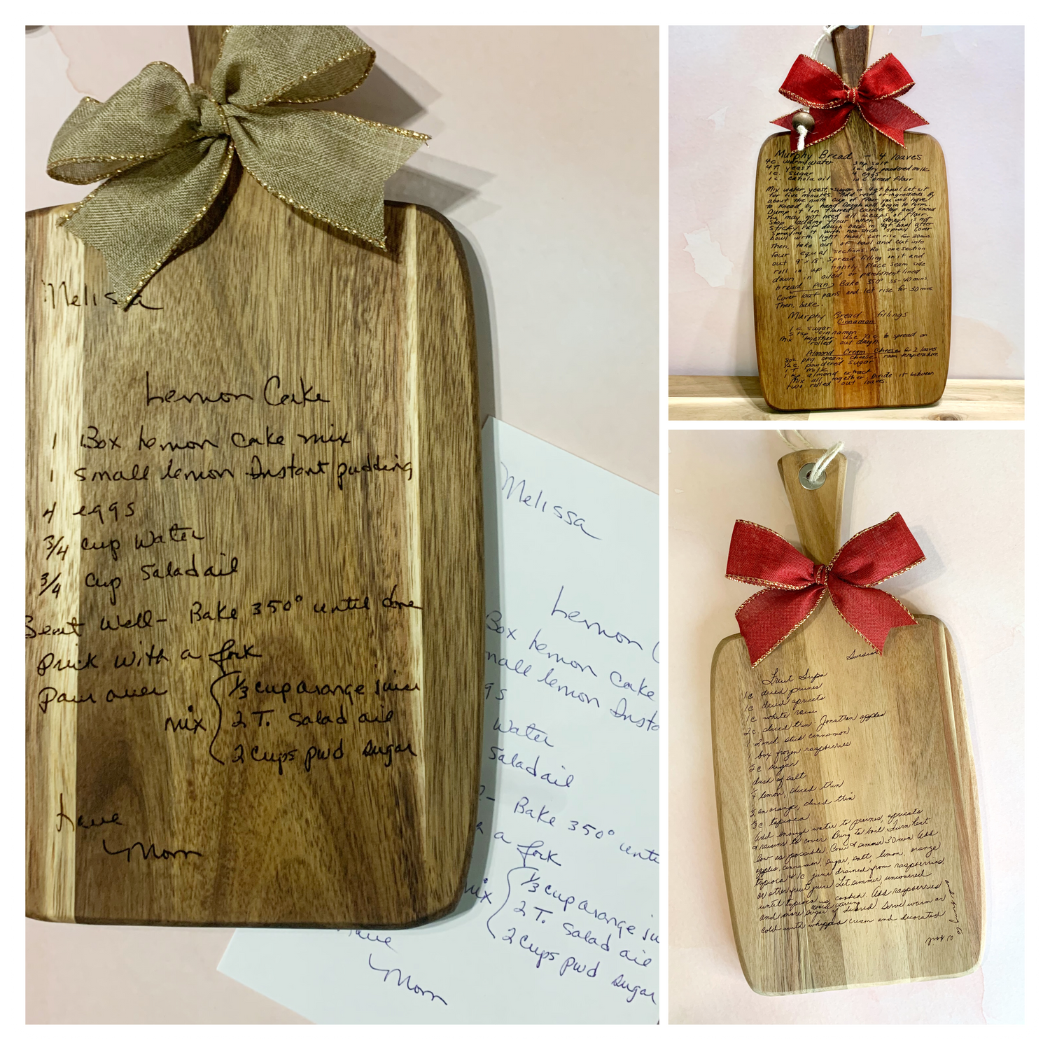 Create a cherished family heirloom with an engraved handwritten recipe cutting board. Send us your favorite recipe and let us turn it into a beautiful piece of art. These boards make the perfect one of a kind gift for Mother’s Day, birthdays, wedding gifts, bridal showers, or any special occasion.